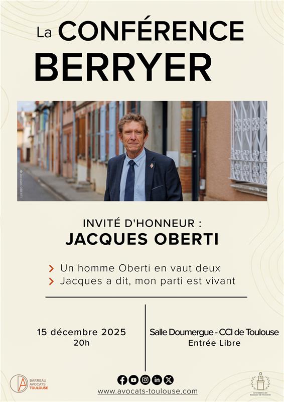 Amateurs de bons mots et d'éloquence : nous sommes heureux de vous annoncer que la Conférence Berryer revient le 15 décembre prochain. À cette occasion, les Secrétaires de la Conférence accueilleront Jacques OBERTI, député de la 10ème circonscription de Haute-Garonne.