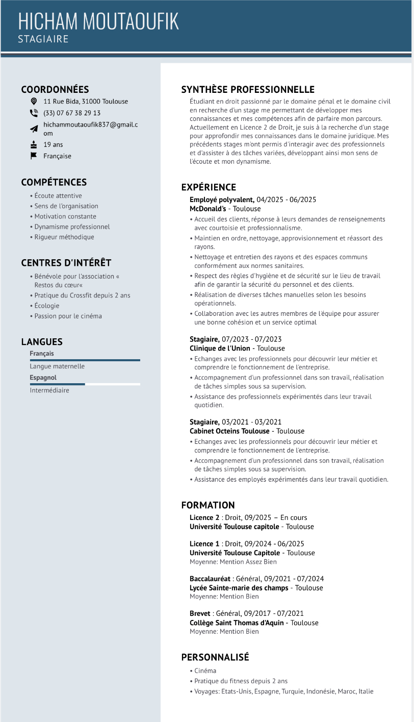 Diplômée d’une Licence de Droit et actuellement étudiante à l’Université Toulouse Capitole pour le diplôme universitaire « Criminologie et sciences pénales », je suis vivement intéressée pour un emploi de 35 heures par semaine en tant qu’assistante juridique à compter du 30 mars jusqu’au 29 mai 2026.