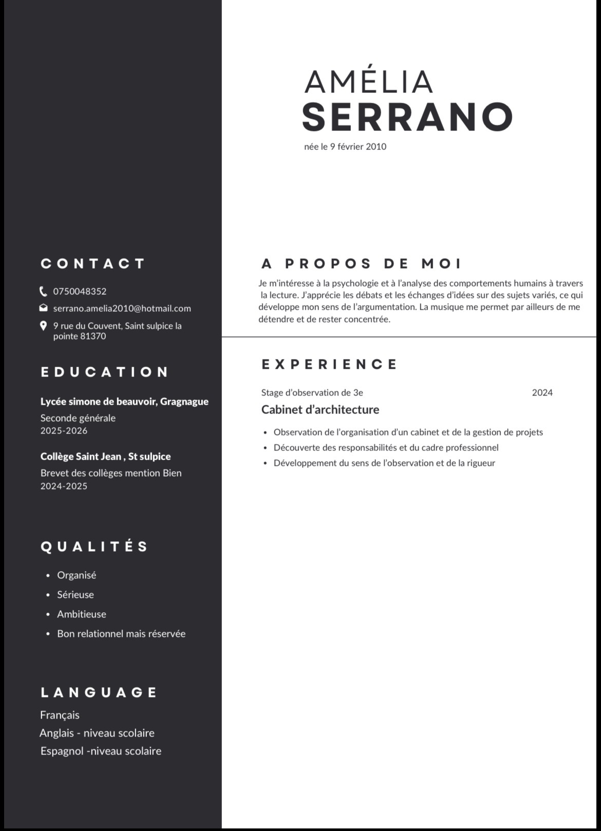 Actuellement en seconde au lycée Simone de Beauvoir à Gragnague, je dois effectuer un stage d’observation du 15/06/26 au 26/06/26, pour cela je vous fais parvenir en pièce jointe, mon CV, ma lettre de motivation et ma convention de stage.